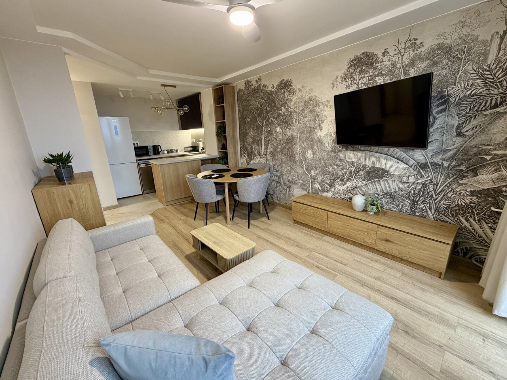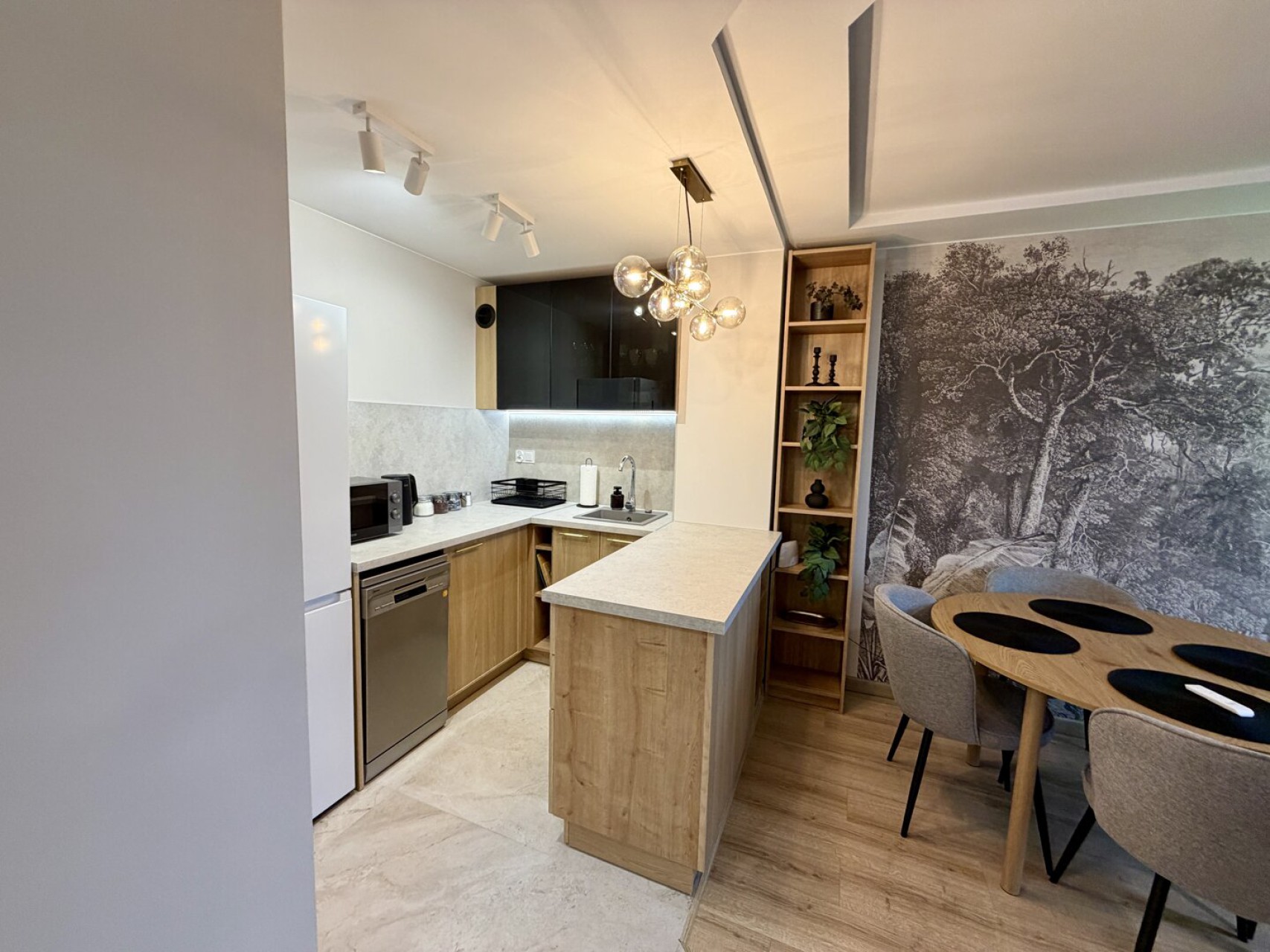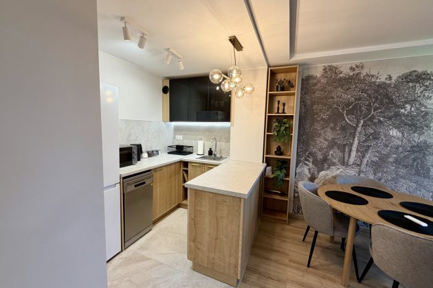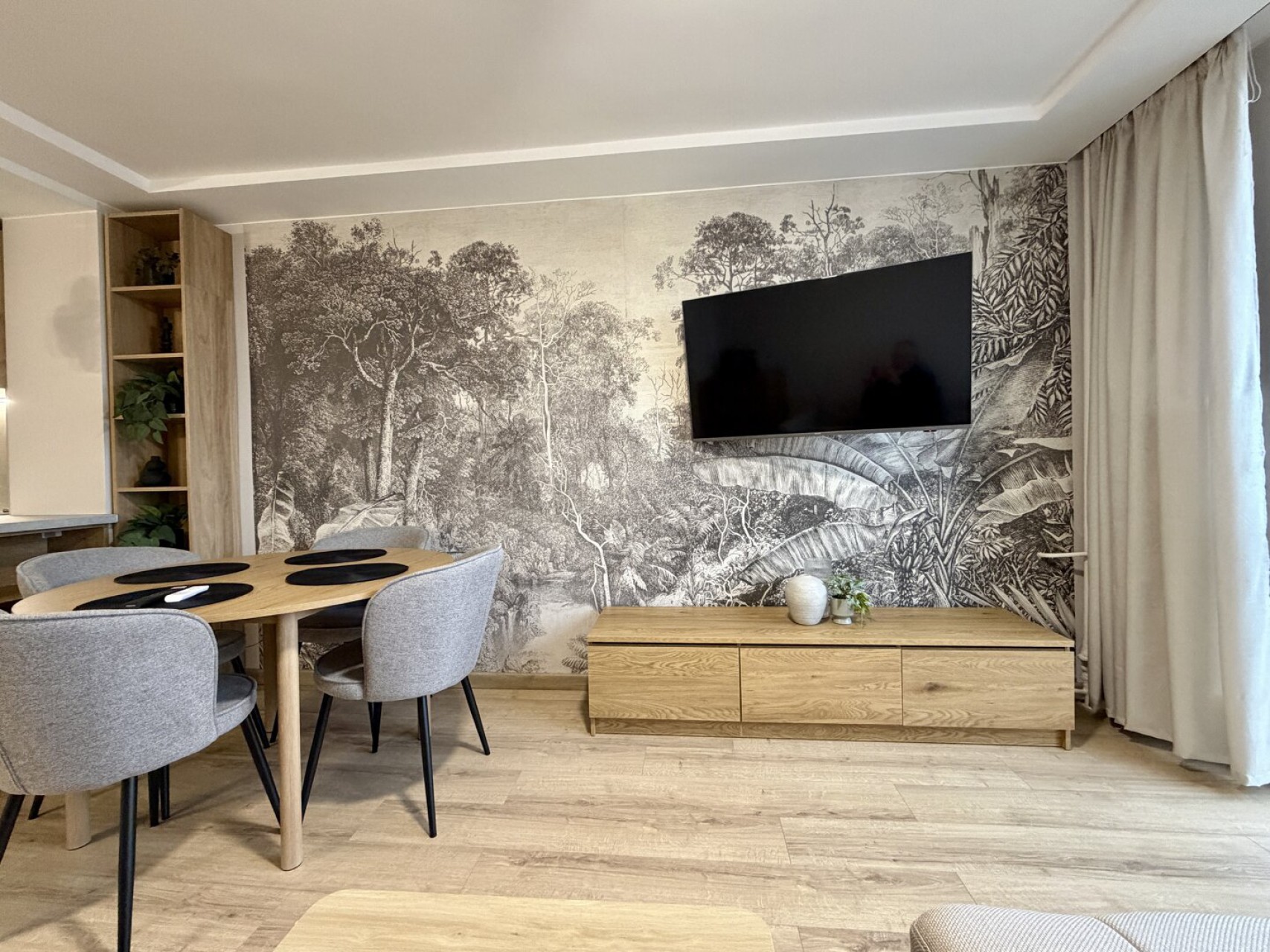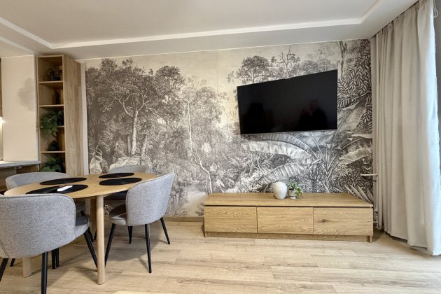 Apartament należy do marki DK Apartmenty – sprawdzonego operatora z kilkudziesięcioma lokalizacjami o podwyższonym standardzie w centrum Olsztyna. Wnętrze zostało zaprojektowane w spójnym stylu: stonowane barwy, dużo drewna, duże grafiki na ścianach i dopracowane detale tworzą atmosferę nowoczesnego, a jednocześnie bardzo domowego miejsca.