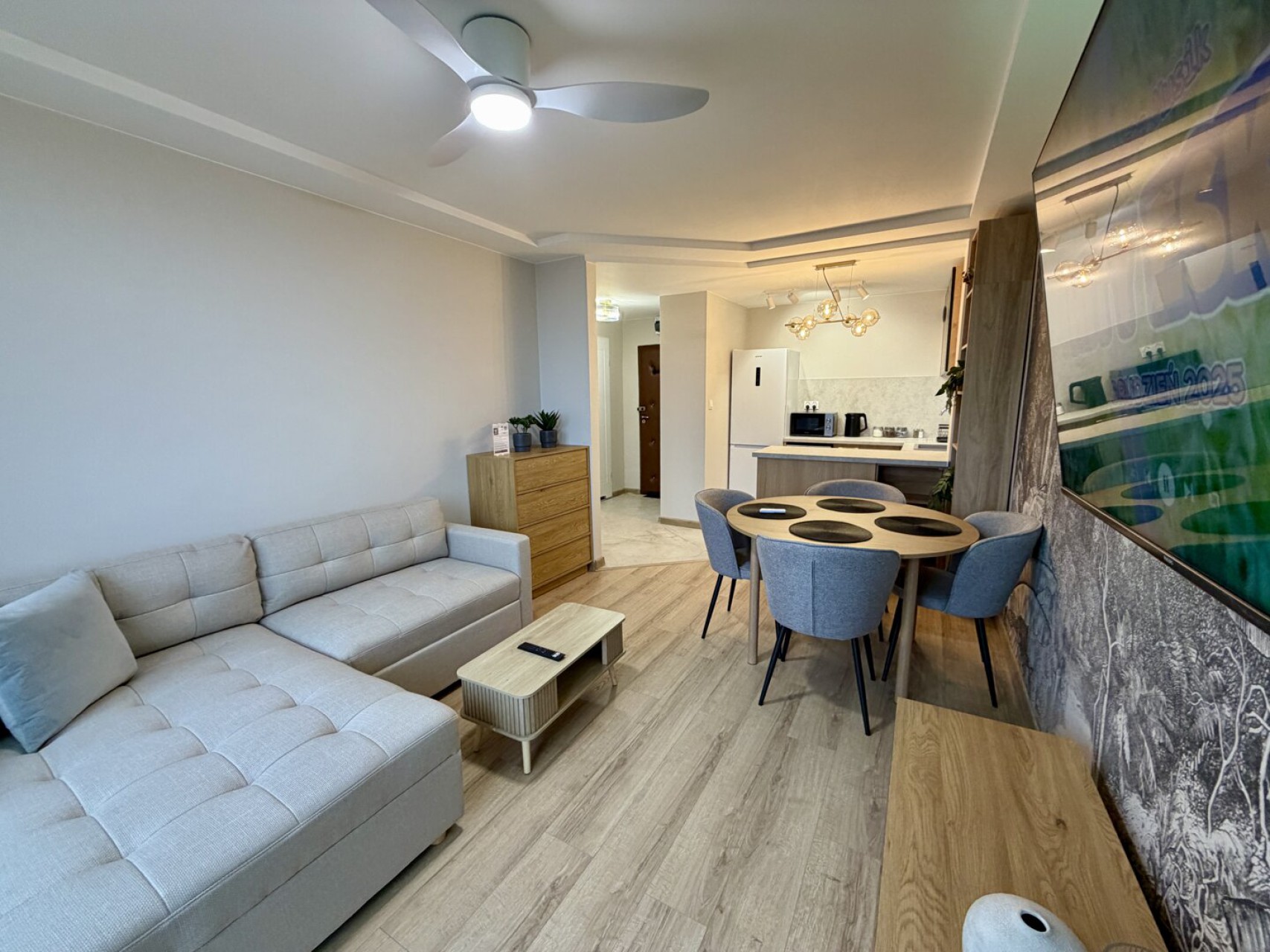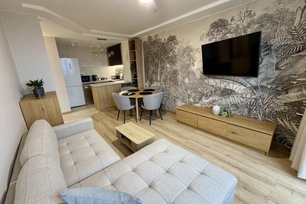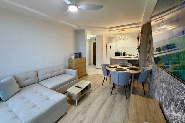 Część dzienna to salon z dużą, wygodną sofą, telewizorem z płaskim ekranem oraz stołem do wspólnych posiłków lub pracy. Otwarta kuchnia jest w pełni wyposażona w niezbędne sprzęty: płytę grzewczą, lodówko-zamrażarkę, zmywarkę, kuchenkę mikrofalową, czajnik oraz komplet naczyń i akcesoriów kuchennych. Dzięki temu bez problemu przygotujesz śniadanie, obiad czy kolację – tak jak w domu.