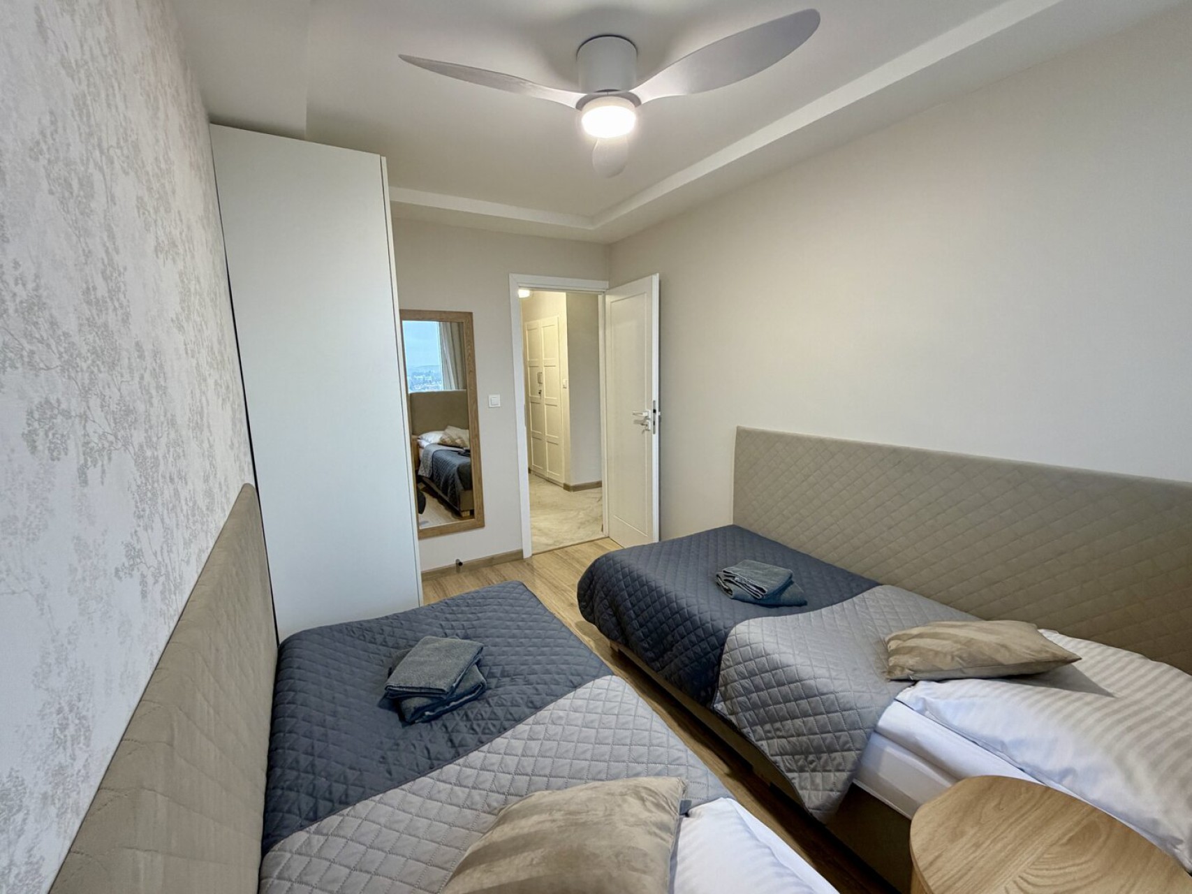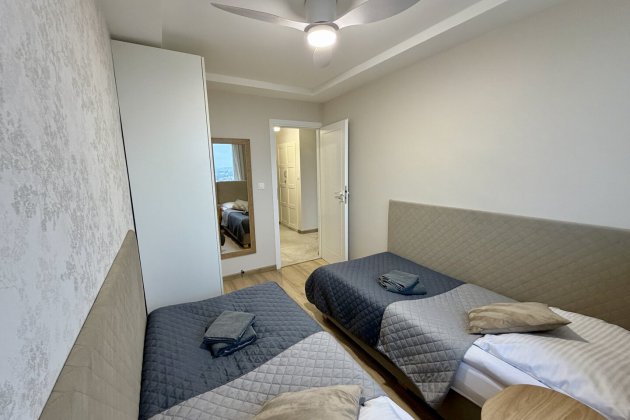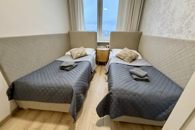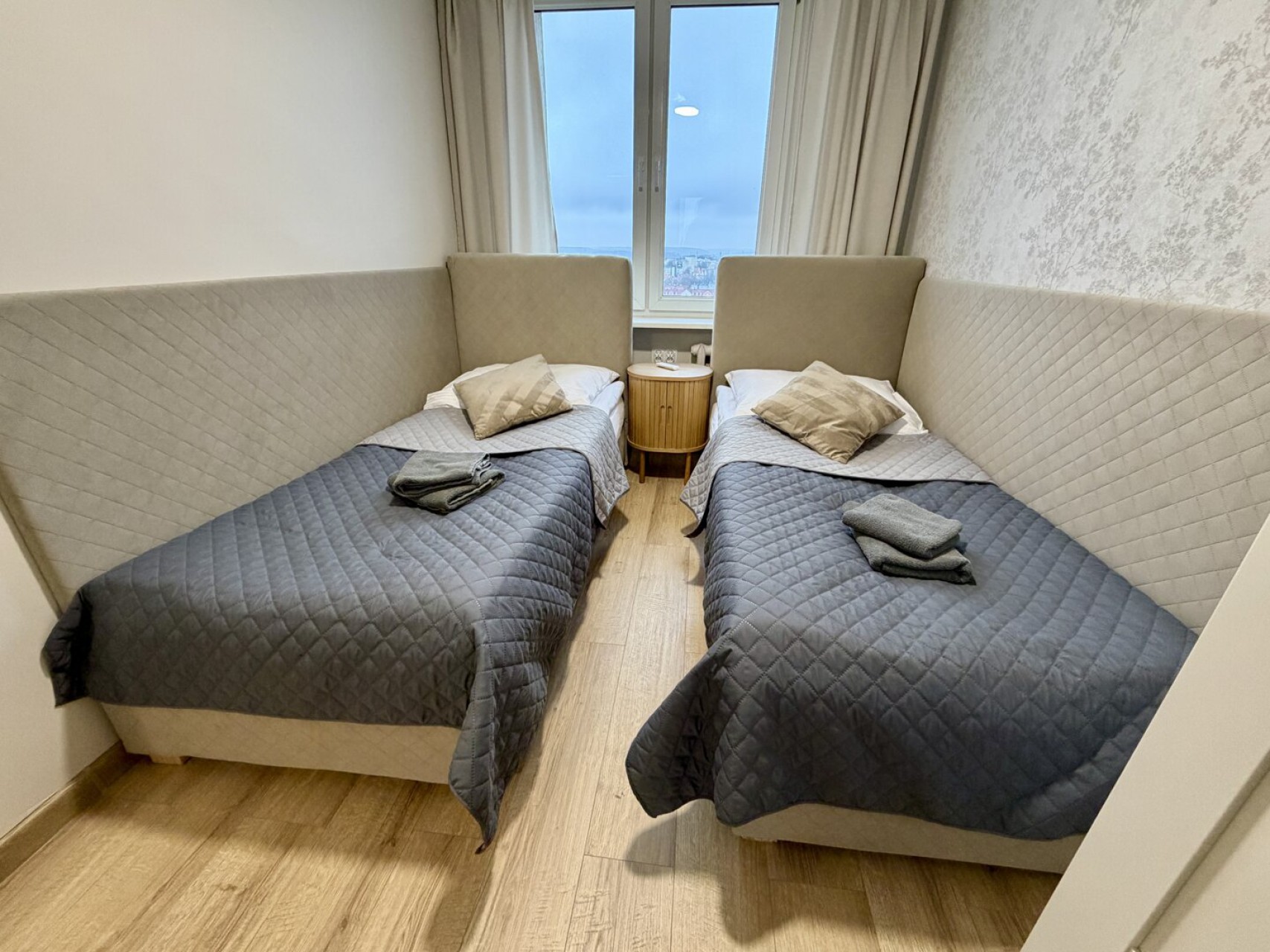 Osobna sypialnia oferuje dwa wygodne łóżka z kompletem świeżej pościeli oraz pojemną szafę na ubrania. Neutralne kolory i zasłony zaciemniające zapewniają dobry sen zarówno po długiej podróży, jak i po całym dniu pracy czy zwiedzania.