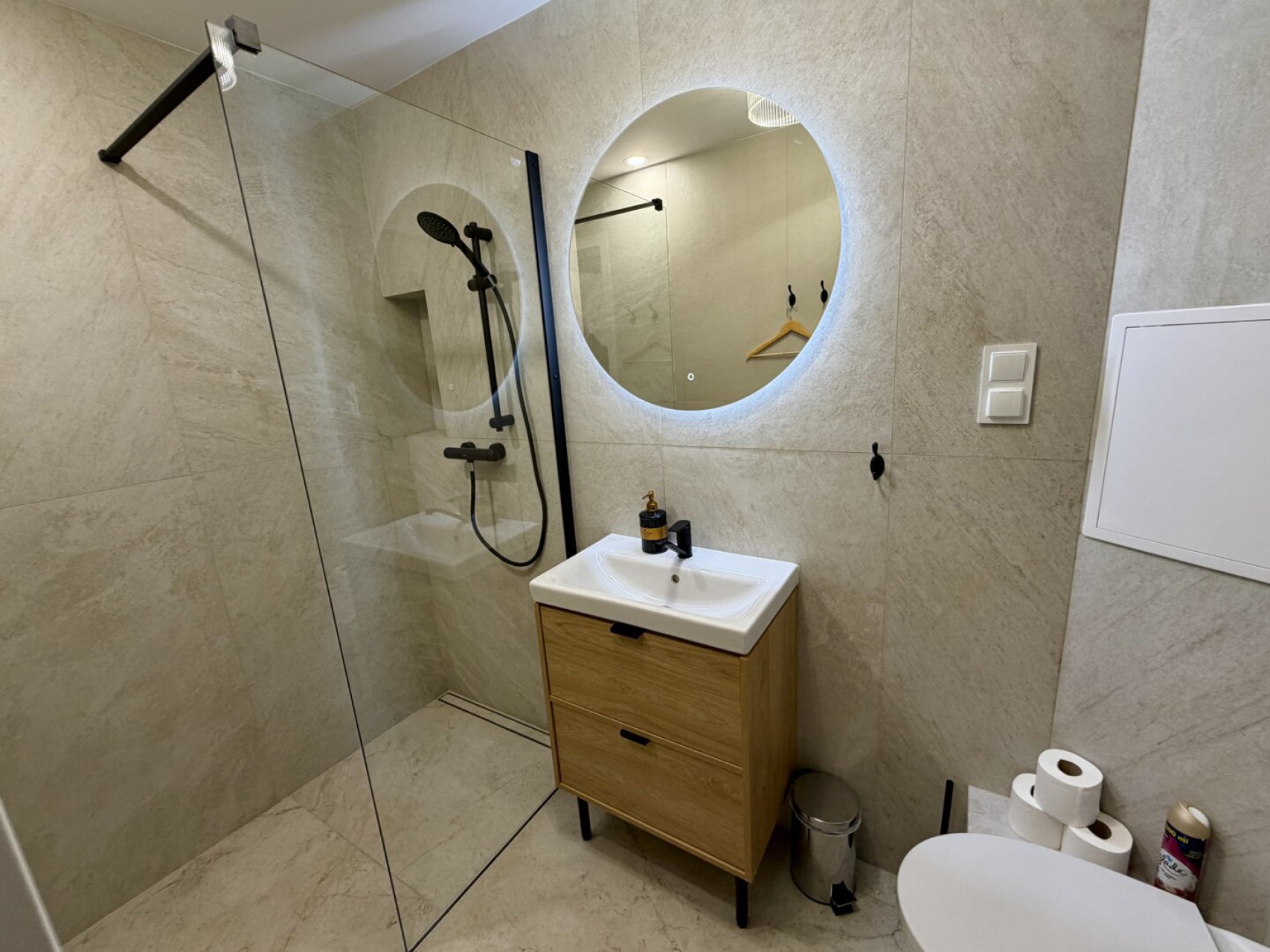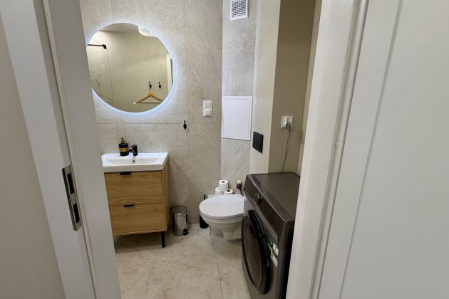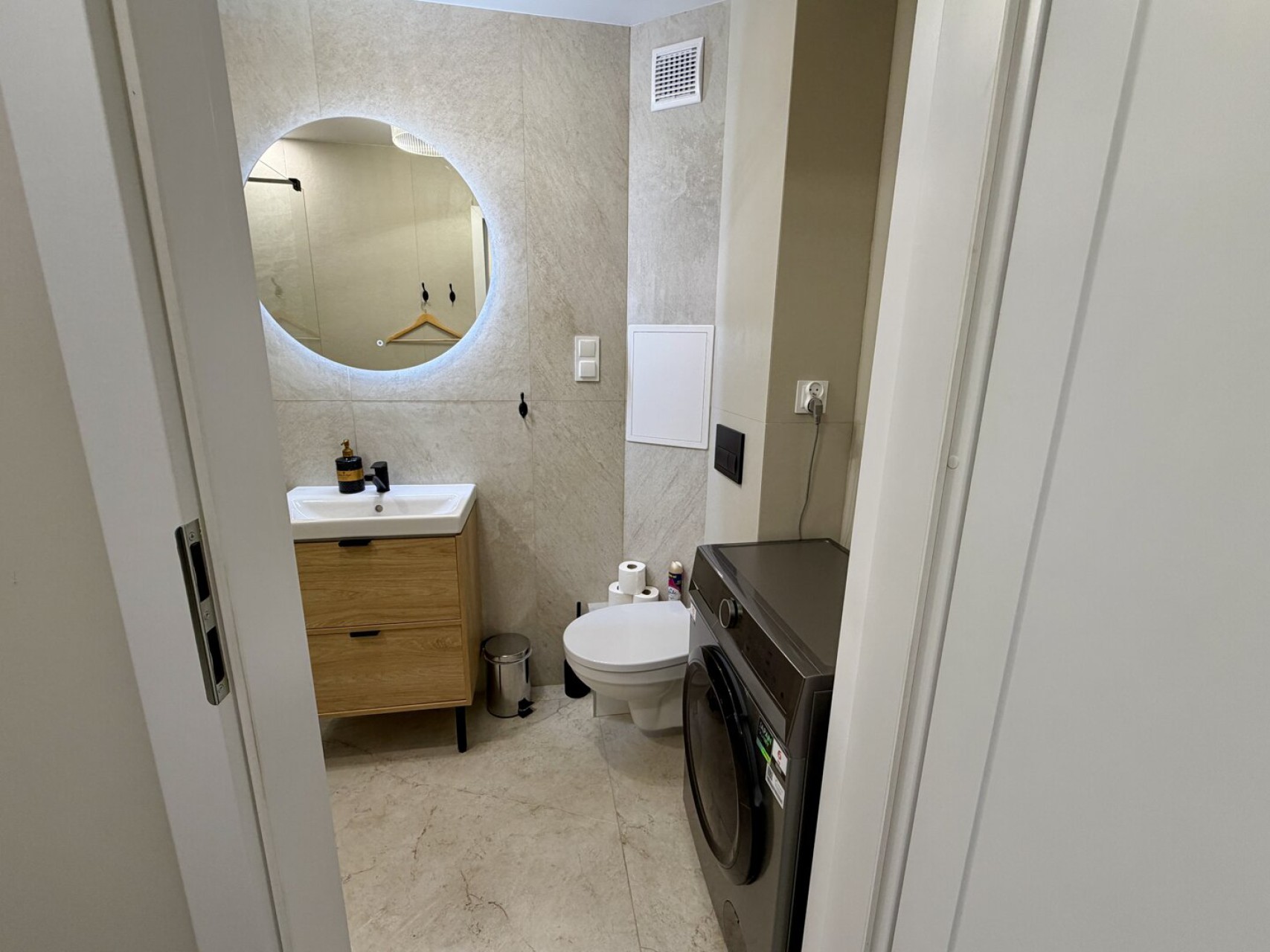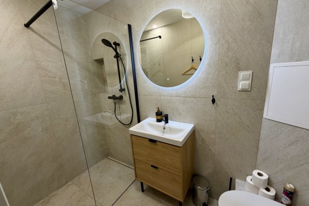 Nowoczesna łazienka z dużym prysznicem typu walk‑in została wyposażona w pralkę, co jest dużym udogodnieniem przy dłuższych pobytach. Do dyspozycji gości są też miękkie ręczniki oraz podstawowe środki higieny. Całość utrzymana jest w hotelowym standardzie, ale z domową wygodą.